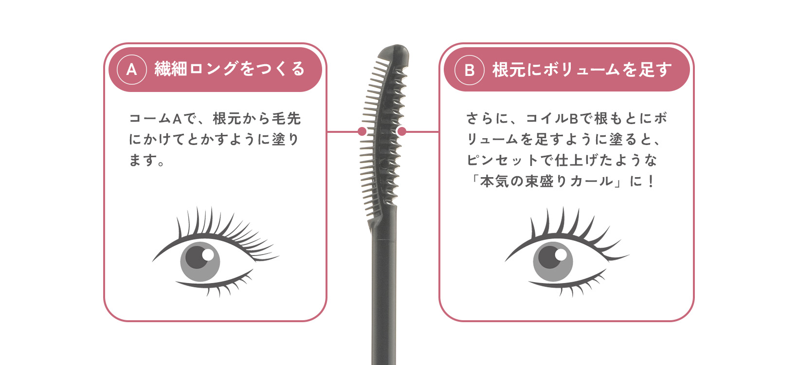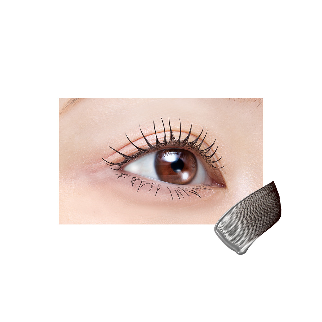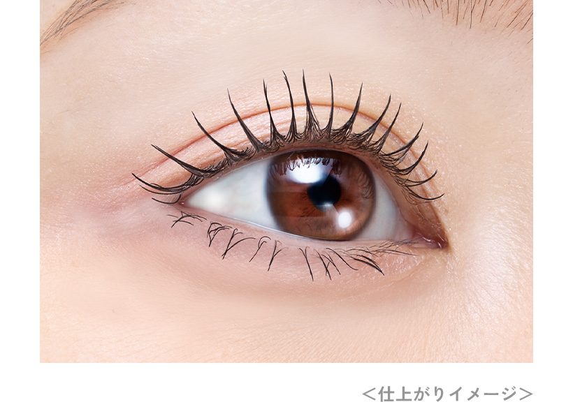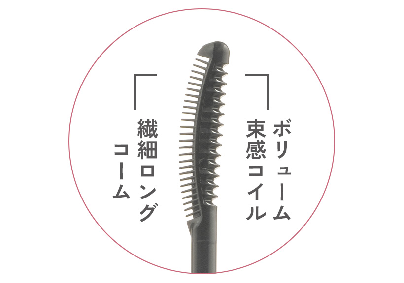 まつ毛をとかすように1本1本に液を塗布し長く美しいまつ毛に仕上げる「繊細ロングコーム」と、まつ毛の根元にボリュームのある束感をメイクする「ボリューム束感コイル」の本格派Wコーム採用。